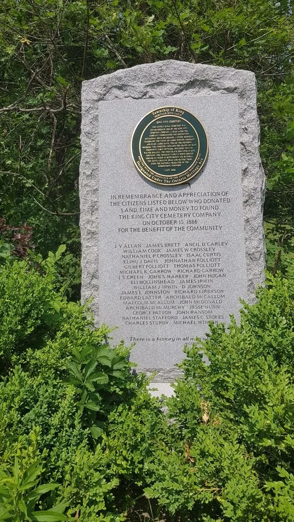 King City Cemetery was founded in 1886 when a group of citizens met and discussed the need for a cemetery in King City. Nathanial Crossley supplied the land at a cost of $1.00. The first meeting was held in Kinghorn and A.D. Carley was appointed Chair, J.W. Crossley Secretary, Thomas Folliott President and Michael Winter Treasurer. At this meeting it was decided that a 6’ high wooden picket fence was to be built at a cost of $3.30 per rod and a Vault building (Deadhouse) was to be built as soon as possible. The cemetery is still run by volunteers and is a not for profit business and welcomes all religions. On June 30, 2007 the Cemetery was designated as a heritage site.